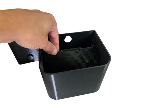 Un premier rangement permet de placer une poubelle de voiture conçue pour s'adapter dans les porte gobelets standards. Un fond amovible est prévu si le porte gobelet n'est pas utilisé.